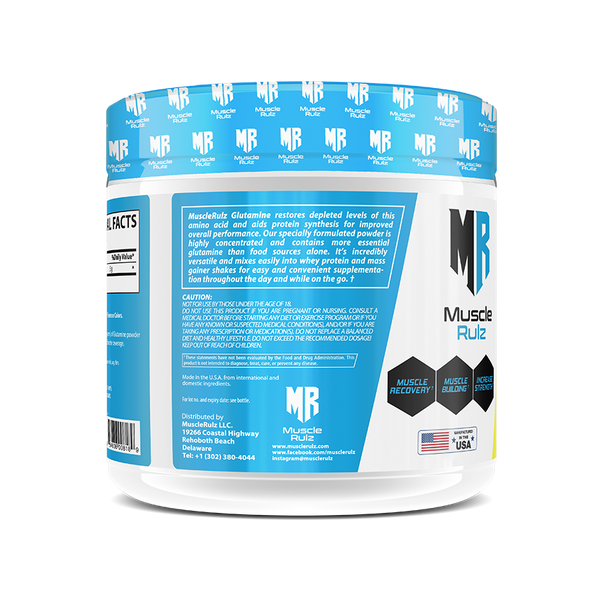 Muscle Rulz Glutamine Powder MuscleRulz Glutamine restores depleted levels of this amino acid and aids protein synthesis for improved overall performance. Our specially formulated powder is highly concentrated and contains more essential glutamine than food sources alone. it's incredibly versatile and mixes easily into whey protein mass gainer shakes for easy and convenient supplementation throughout the day and while on the go.†